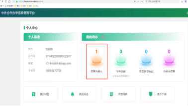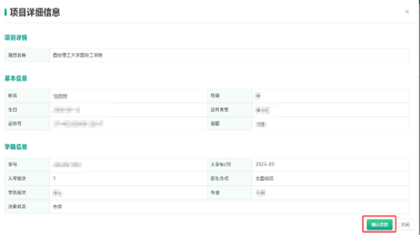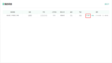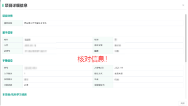 第二步:在系统“个人中心-我的待办”板块中点击“信息待确认”,跳转至“我的项目”点击“详情”,逐项核实姓名、性别、生日、证件号、学号、入学年/月、学历层次、专业等关键信息;
