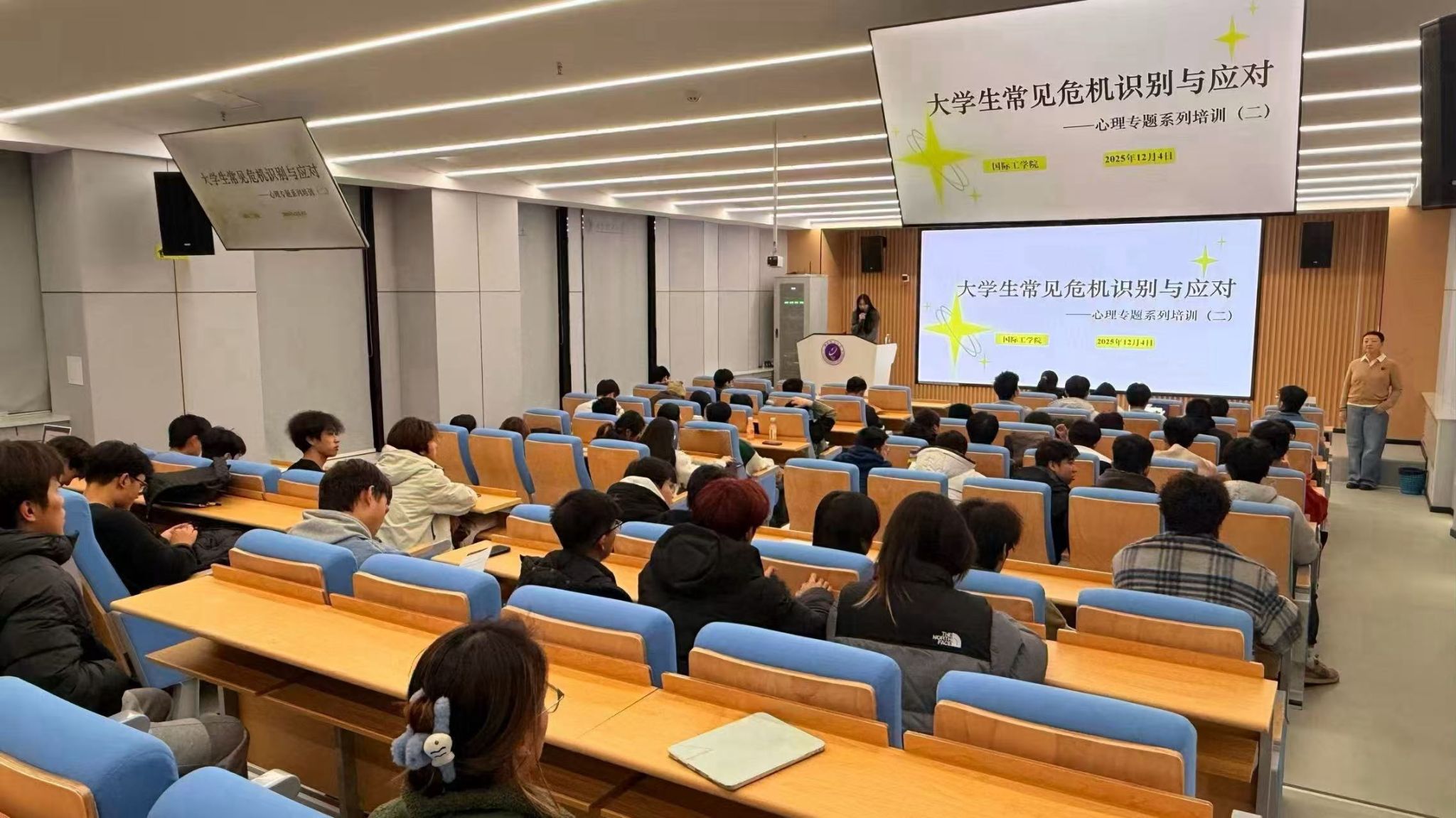 为进一步提升学生心理骨干队伍的专业素养与危机应对能力,切实织密校园心理安全防护网,12月4日晚,我院于综南楼119教室开展秋季学期心理专题培训第二讲,主题聚焦“大学生常见危机识别与应对”。本次培训特邀学校心理健康教育中心副主任李进老师担任主讲,学院心理专干张帅主持,心理委员、宿舍心晴员参与学习。